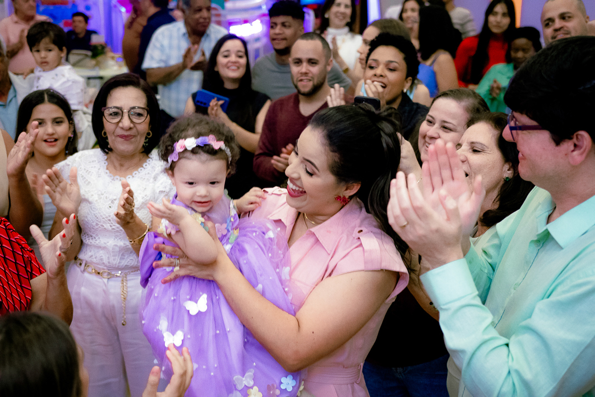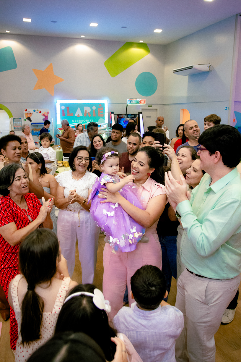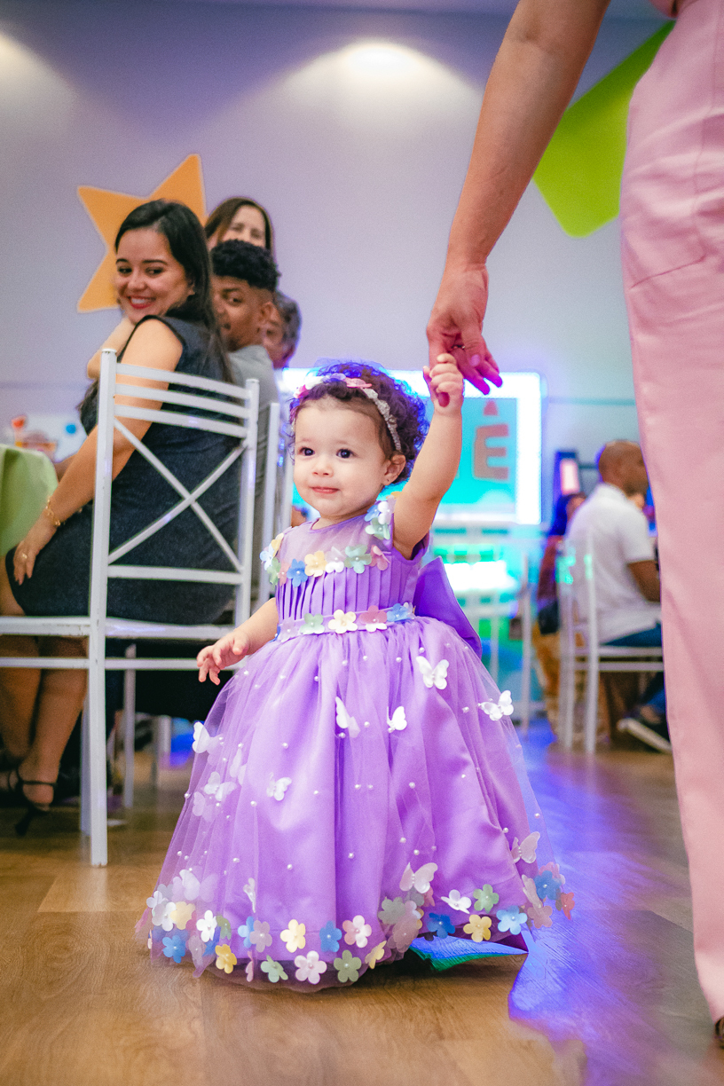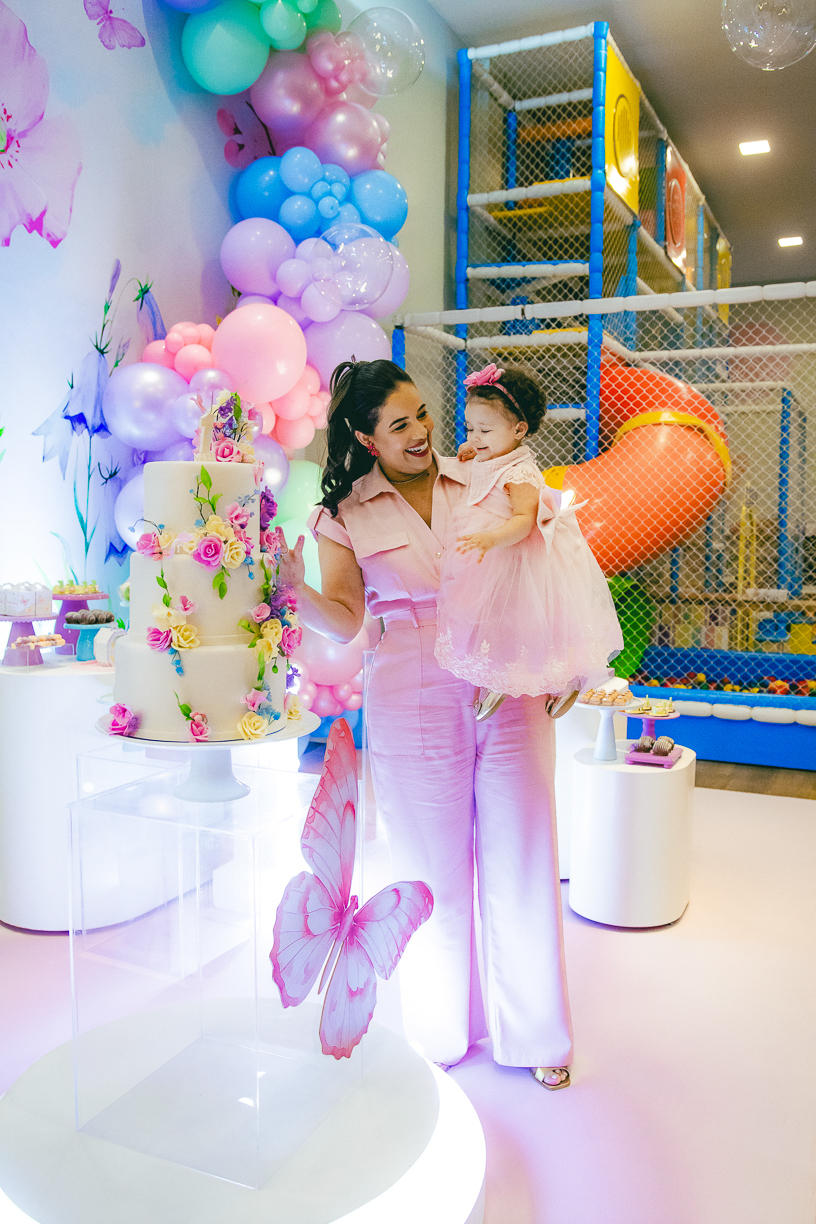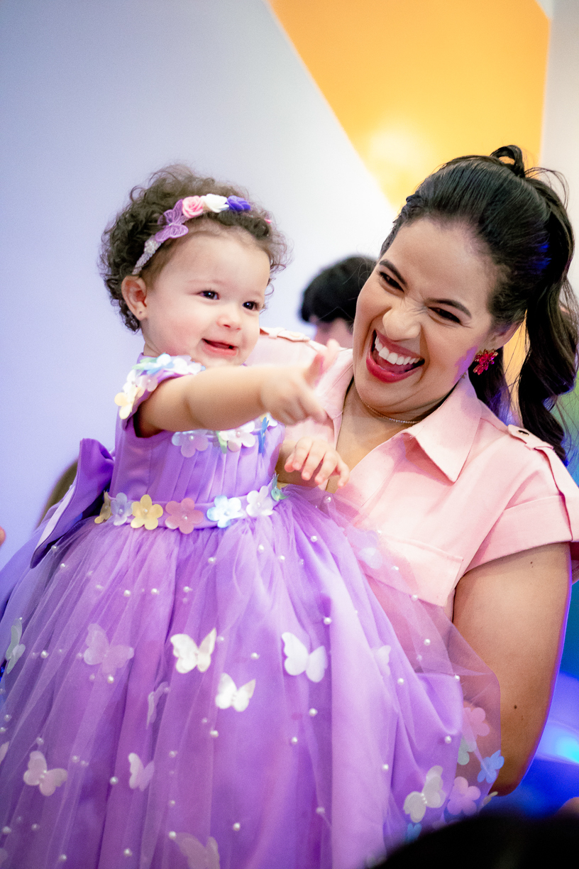 O tema de borboletas encheu o espaço com tons suaves de roxo, rosa e amarelo, criando uma atmosfera delicada e acolhedora. Desde o início, ela se mostrou encantada com cada detalhe, distribuindo sorrisos pra todo mundo e encantando quem se aproximava.