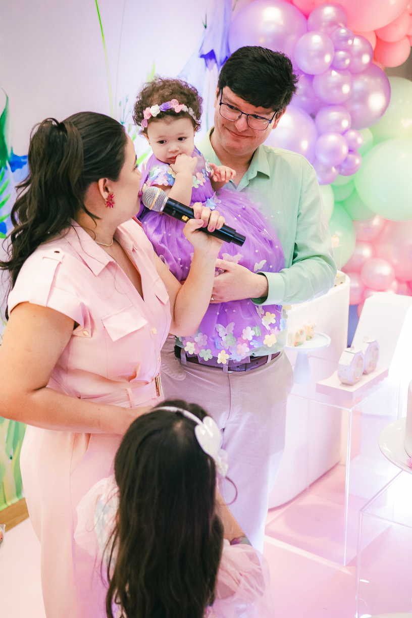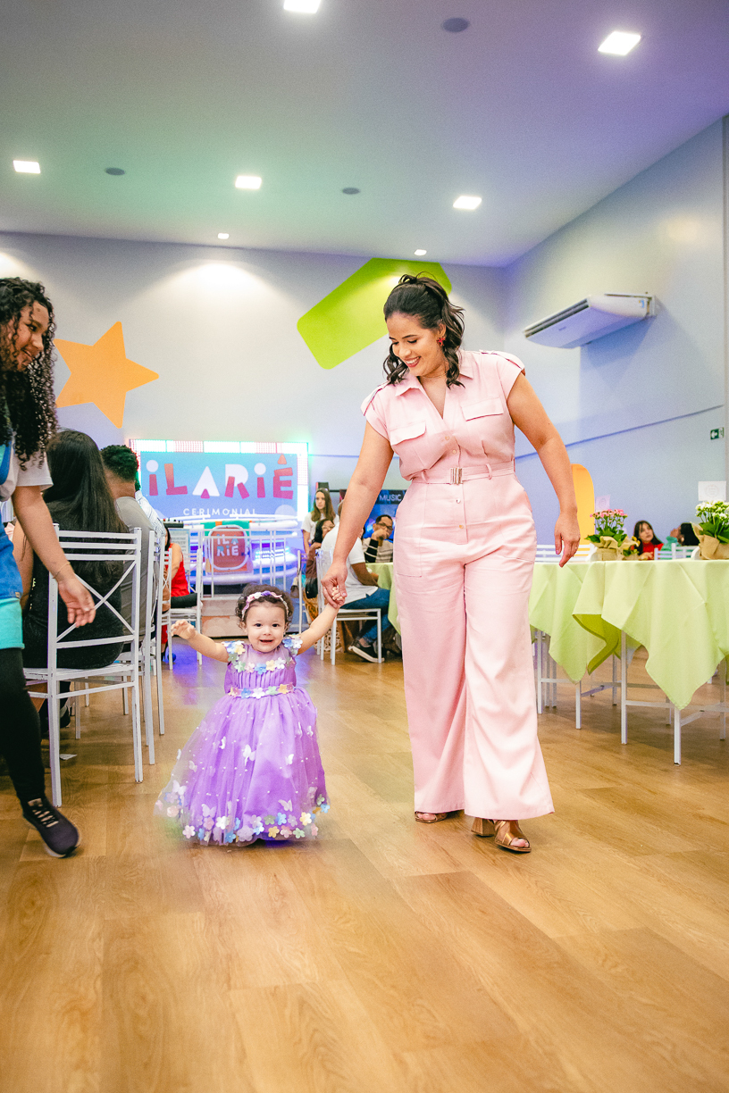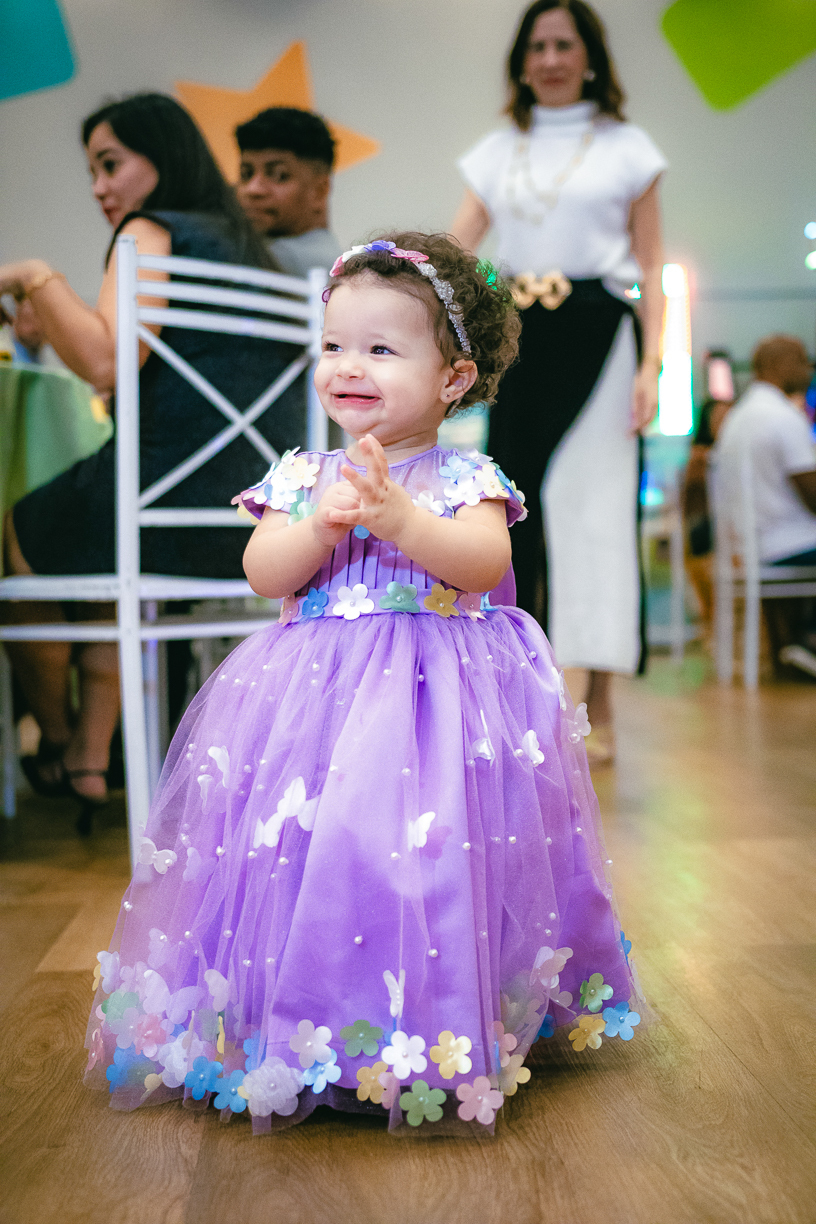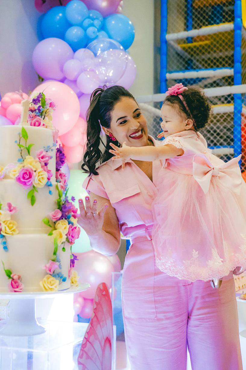 O tema de borboletas encheu o espaço com tons suaves de roxo, rosa e amarelo, criando uma atmosfera delicada e acolhedora. Desde o início, ela se mostrou encantada com cada detalhe, distribuindo sorrisos pra todo mundo e encantando quem se aproximava.