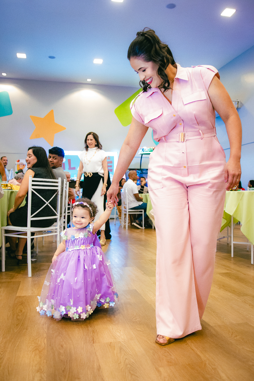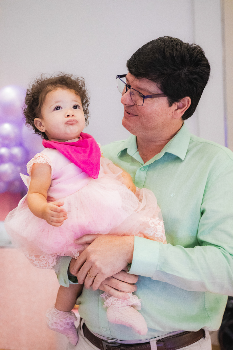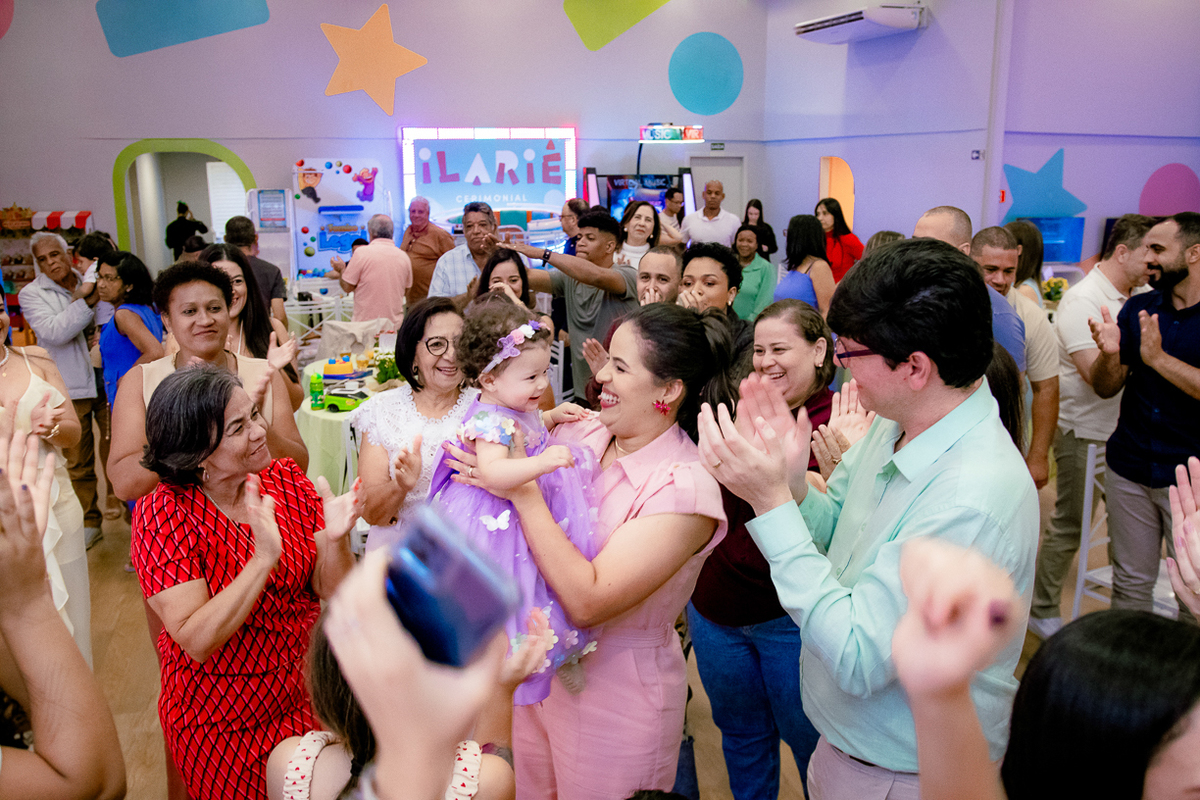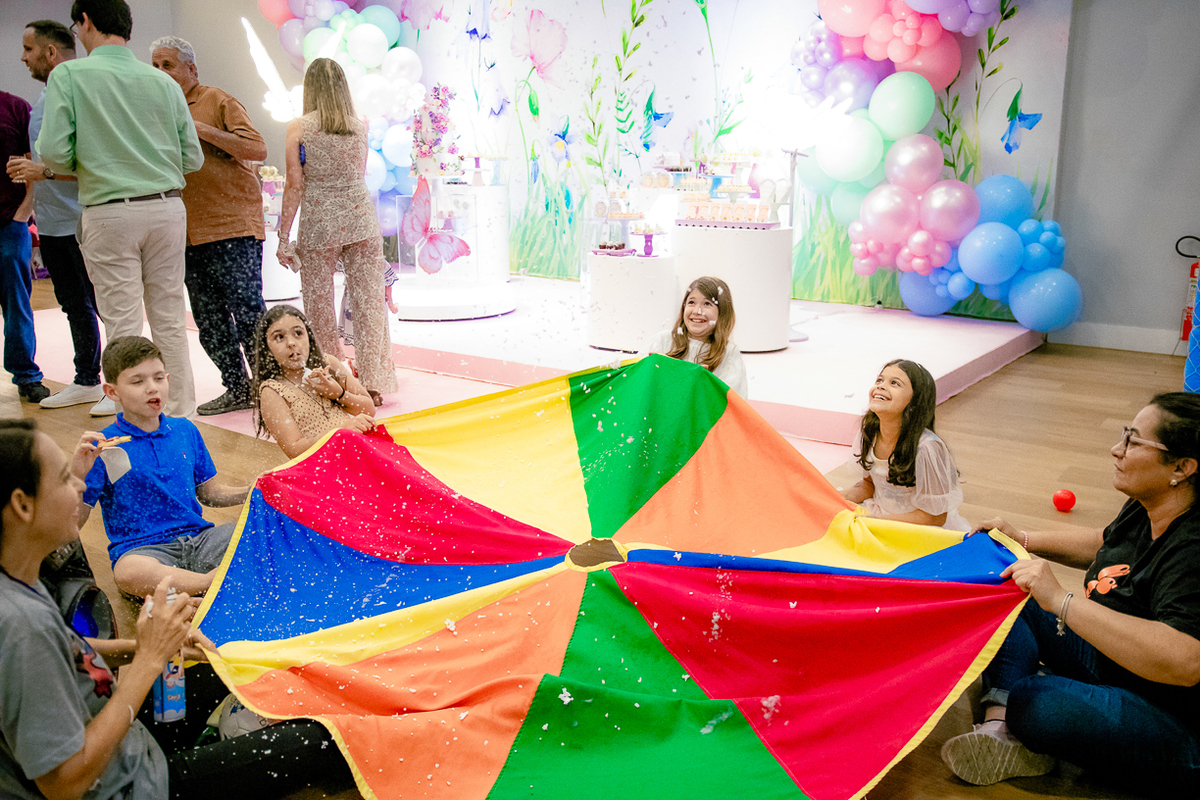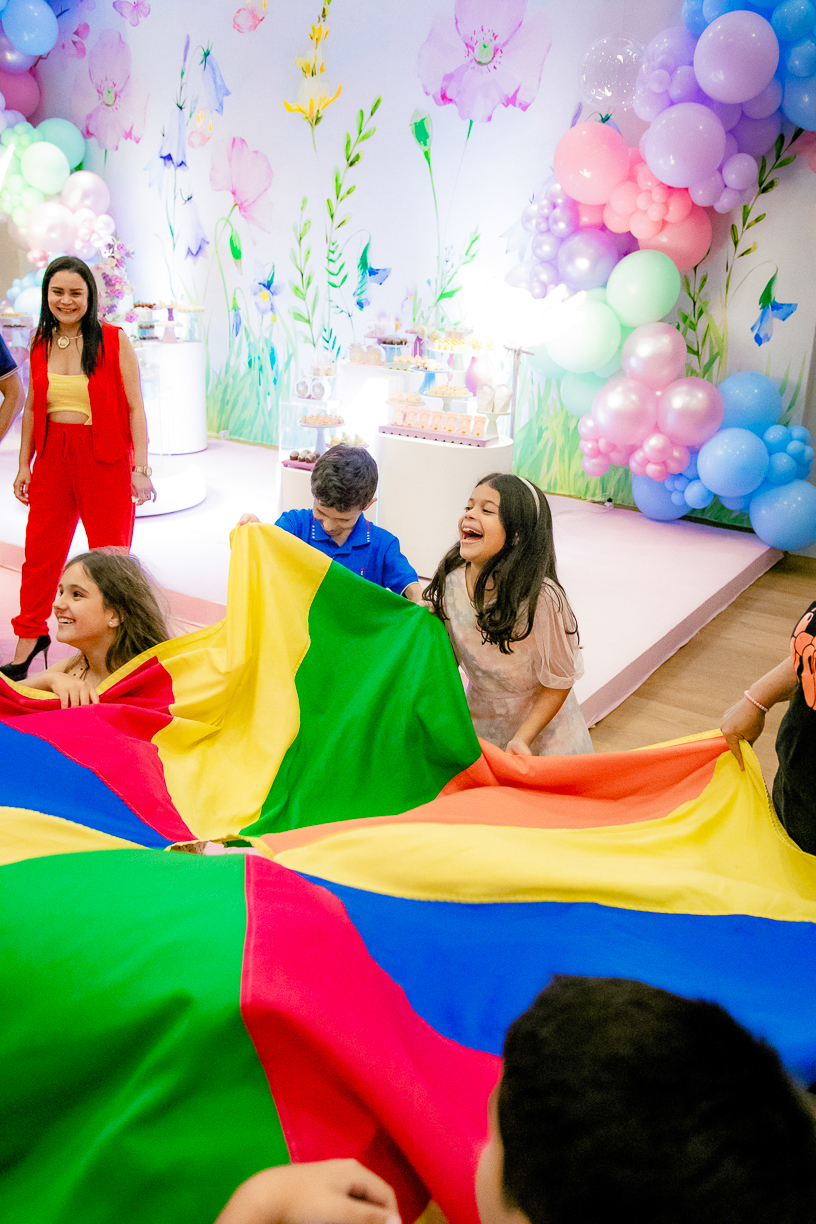 O tema de borboletas encheu o espaço com tons suaves de roxo, rosa e amarelo, criando uma atmosfera delicada e acolhedora. Desde o início, ela se mostrou encantada com cada detalhe, distribuindo sorrisos pra todo mundo e encantando quem se aproximava.