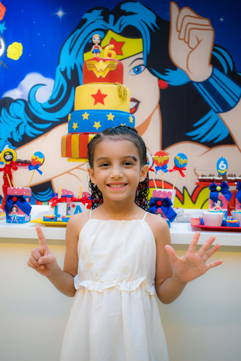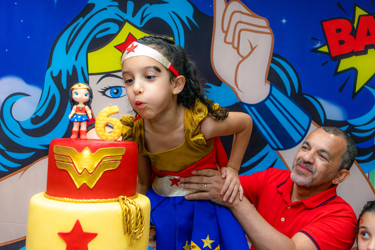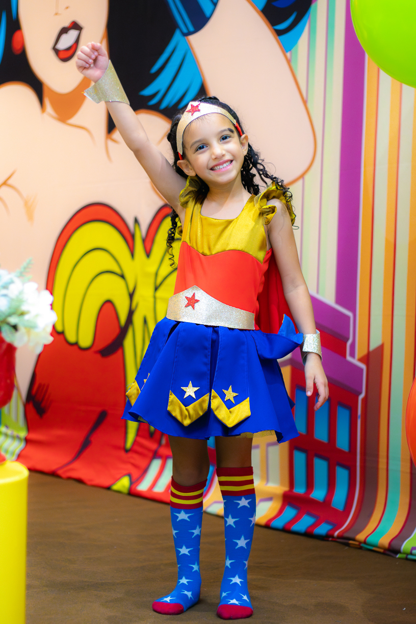 O salão já pulsava em cores de super-heroína, mas foi o sorriso dela que iluminou tudo. Com a tiara dourada e o olhar brilhante, ela caminhava entre amigos e familiares como quem sabia que aquele dia era seu, cabeça erguida e passos firmes! Cada risada valia mais do que qualquer superpoder.