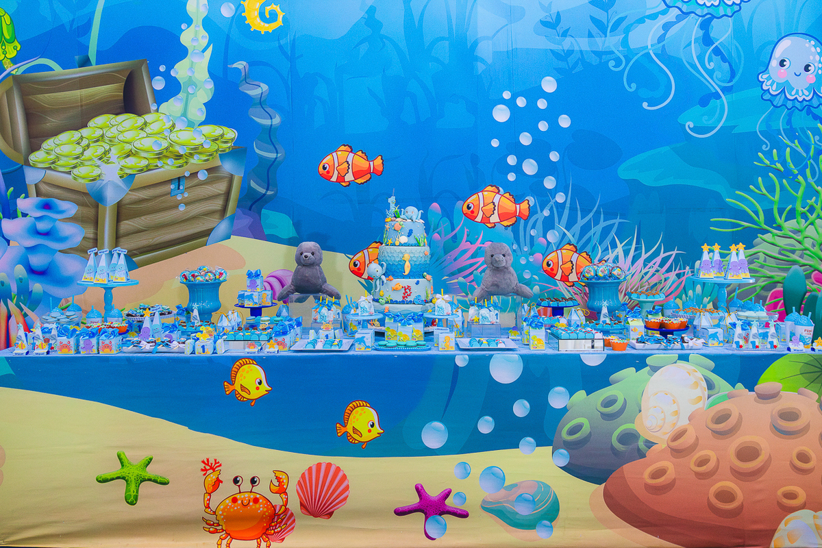 Nesse dia o salão se transformou em um grande oceano! Cheio de tons de azul, conchas e pequenas pérolas que pareciam guardar a magia daquele dia.