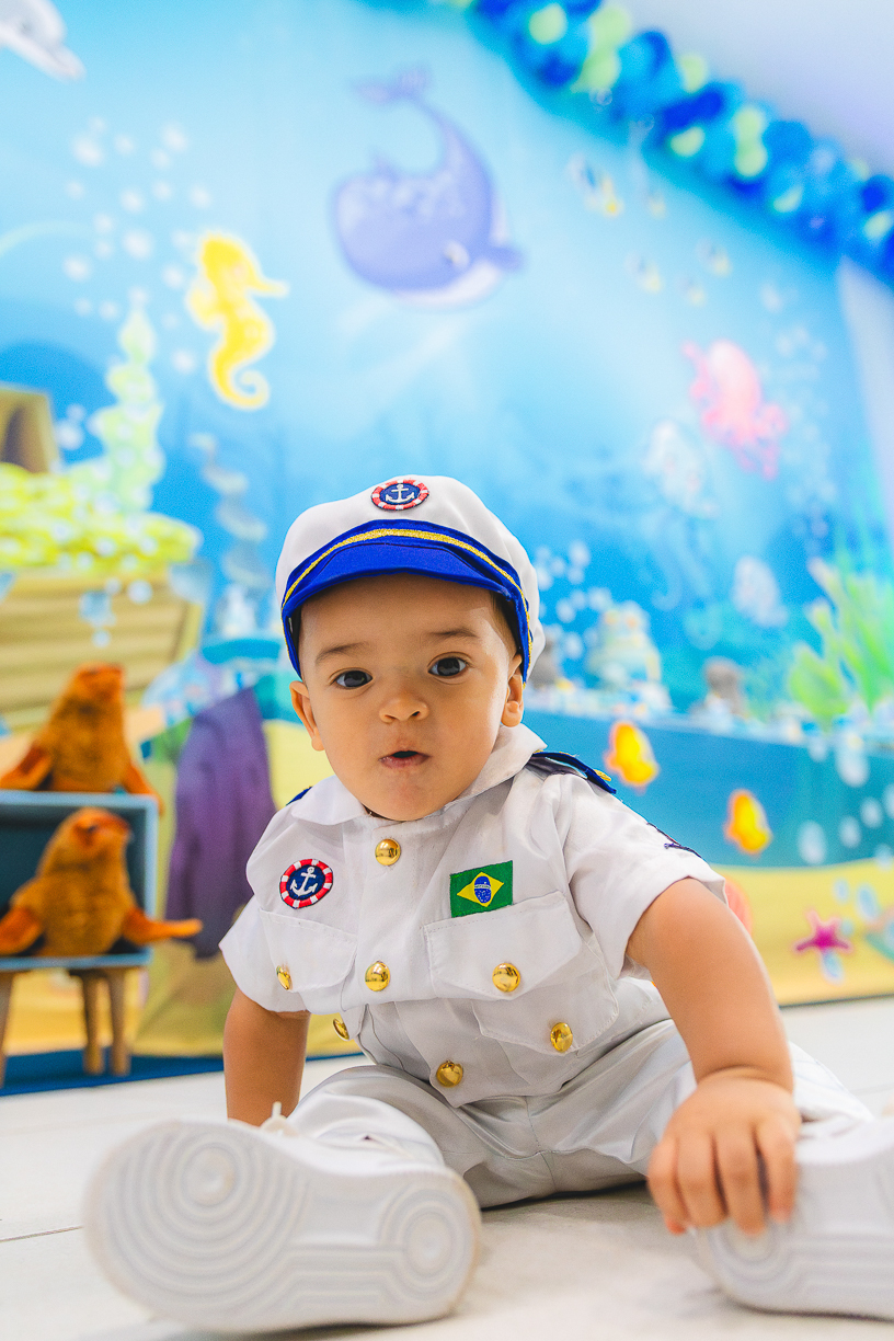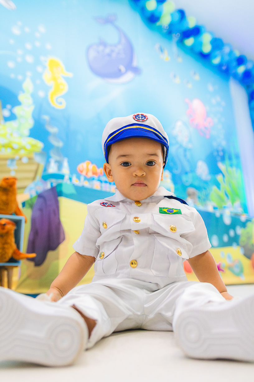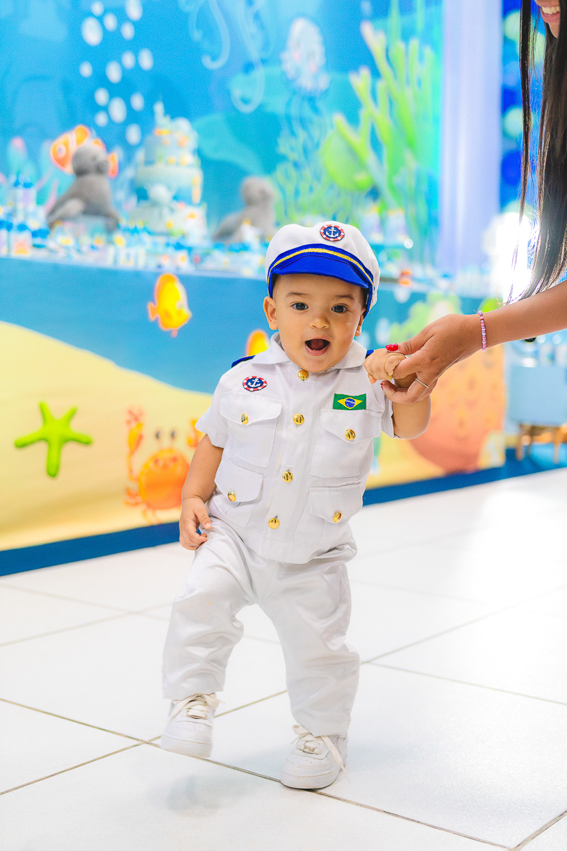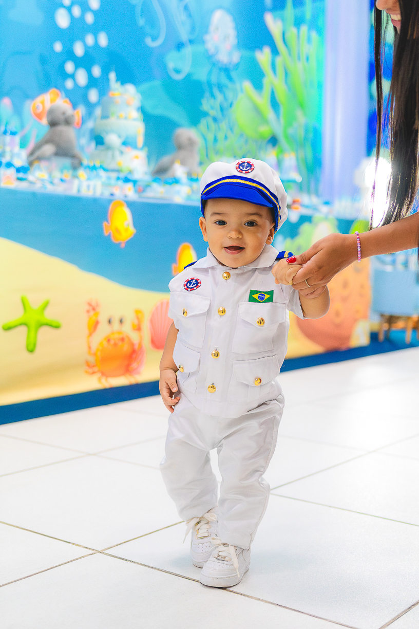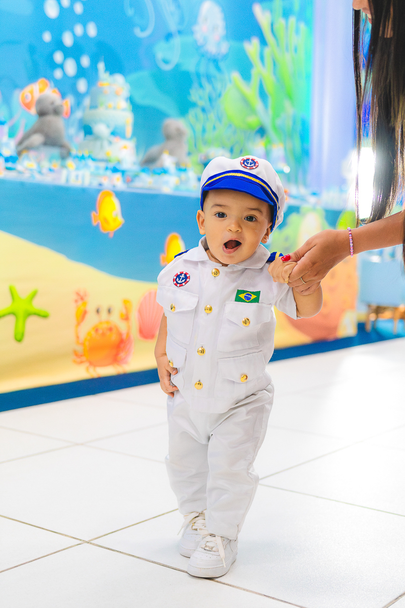No centro, ele, a coisa mais fofa kkkkkk vestido de marinheiro, navegando com o olhar curioso de quem descobre o mundo pela primeira vez.