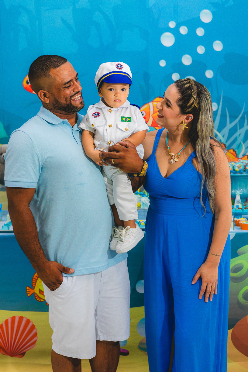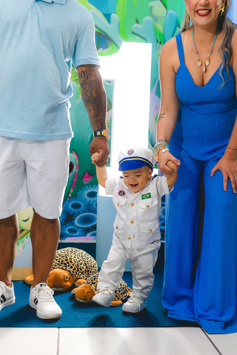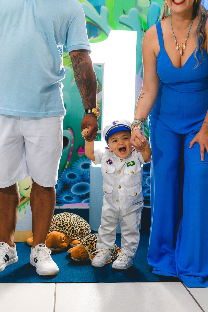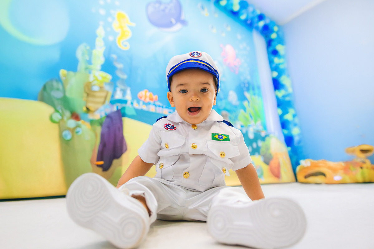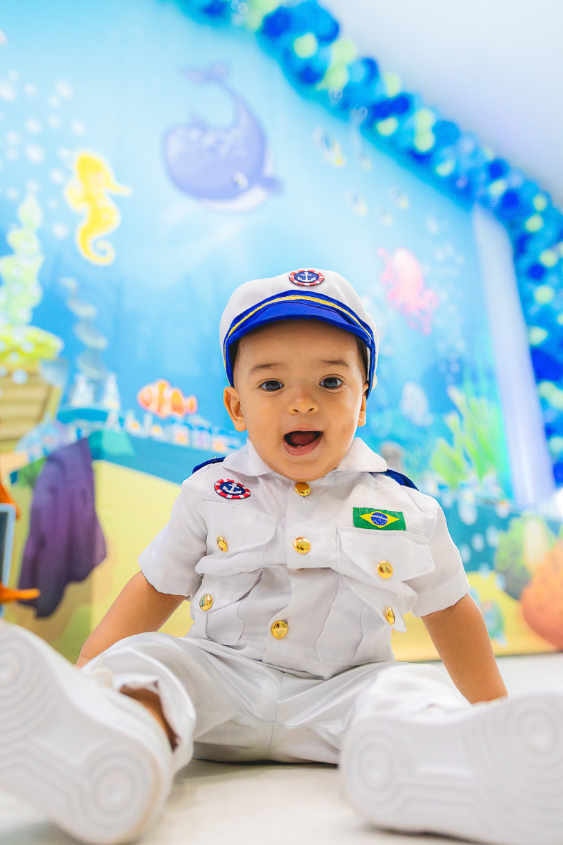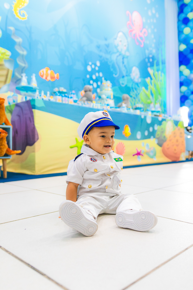 No centro, ele, a coisa mais fofa kkkkkk vestido de marinheiro, navegando com o olhar curioso de quem descobre o mundo pela primeira vez.