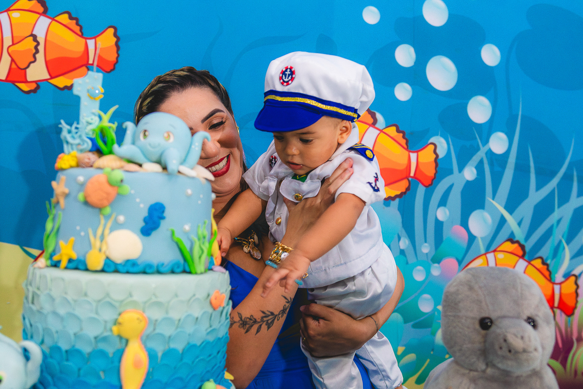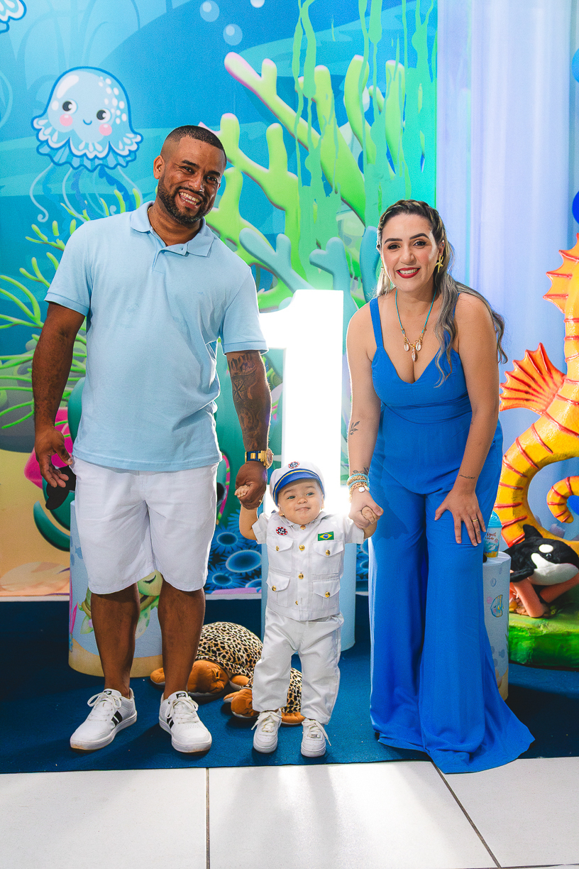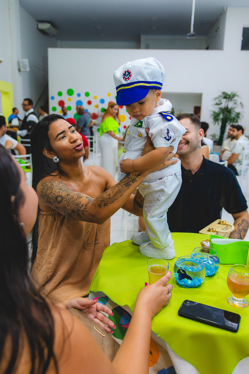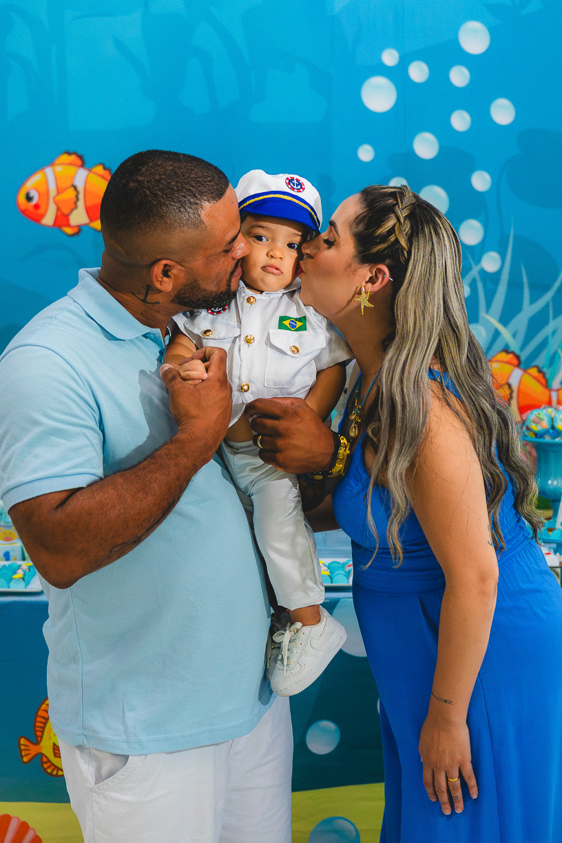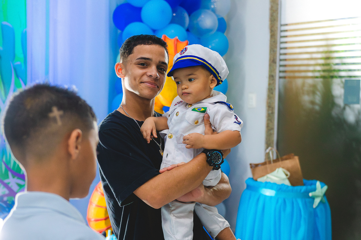 No centro, ele, a coisa mais fofa kkkkkk vestido de marinheiro, navegando com o olhar curioso de quem descobre o mundo pela primeira vez.