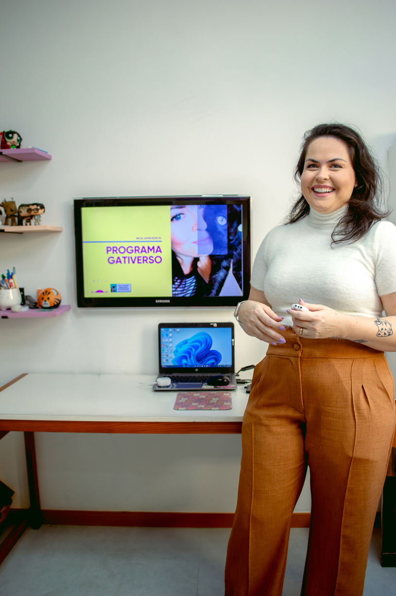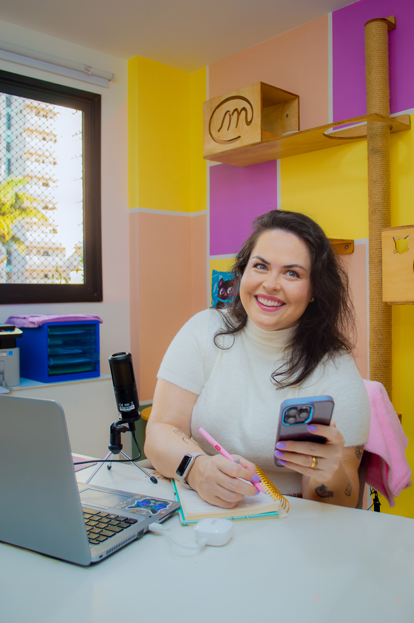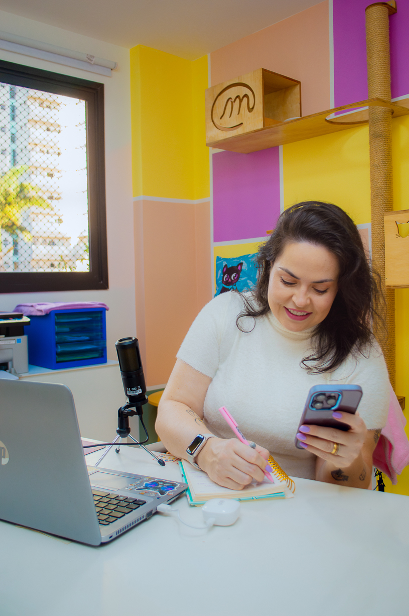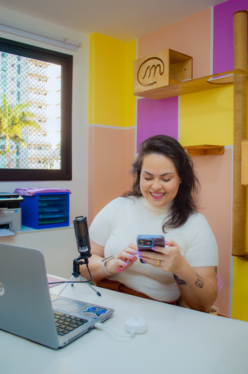 Além dos momentos de carinho com os gatos, incluímos elementos que representam seus serviços, como as videochamadas e vídeoaulas que ela realiza com tutores de pets. O resultado foi um ensaio que une profissionalismo, empatia e o toque pessoal que diferencia o trabalho da Manuela.