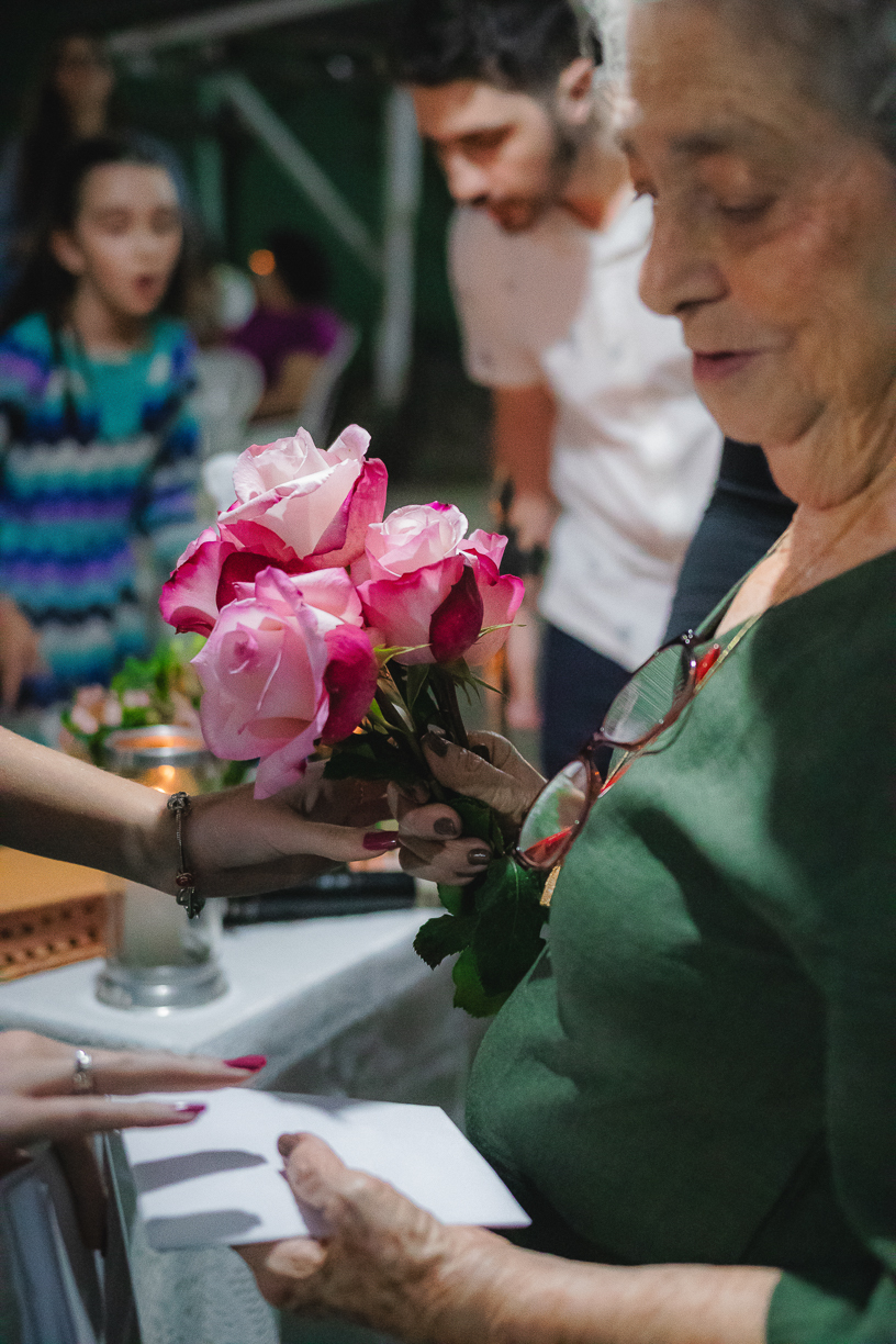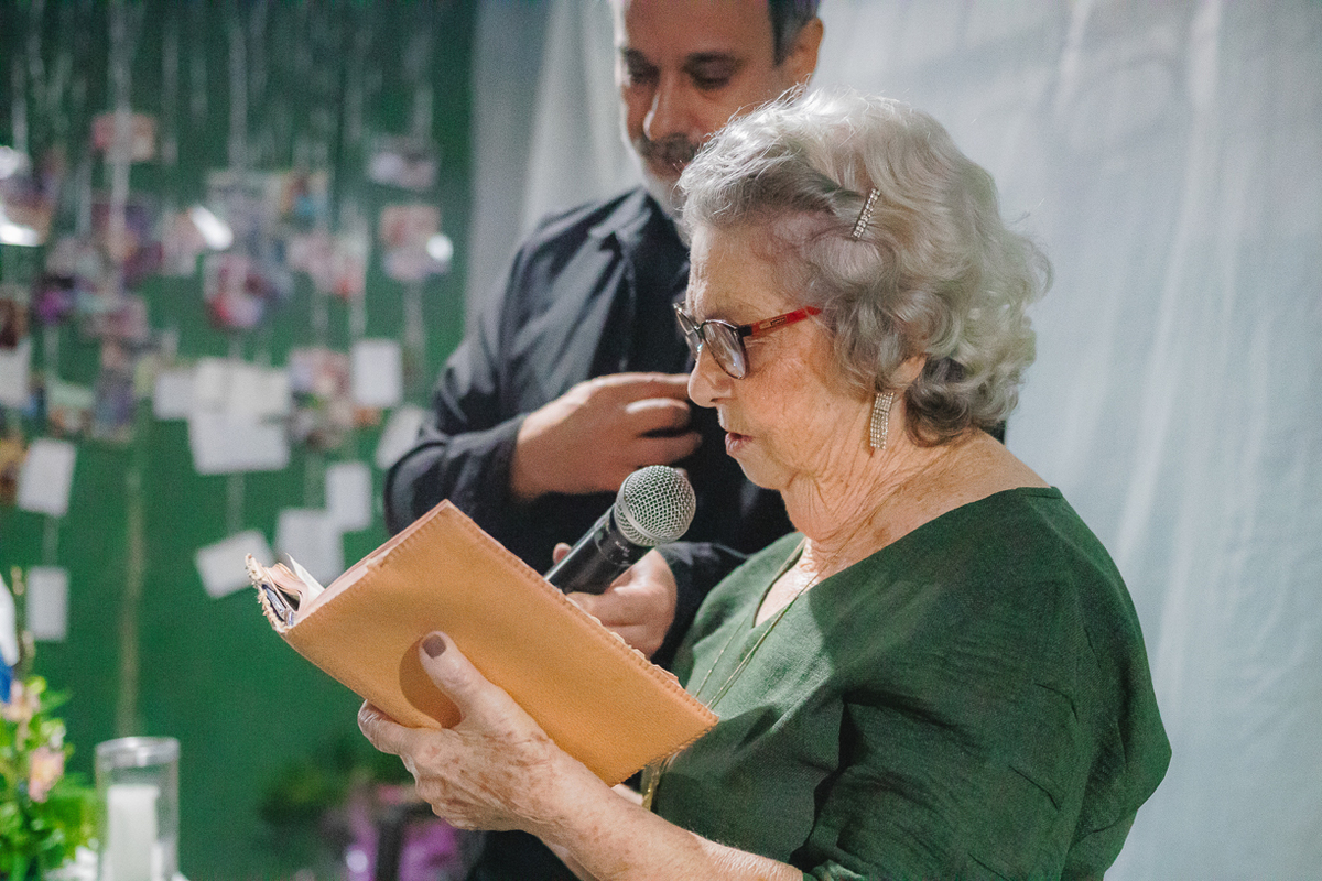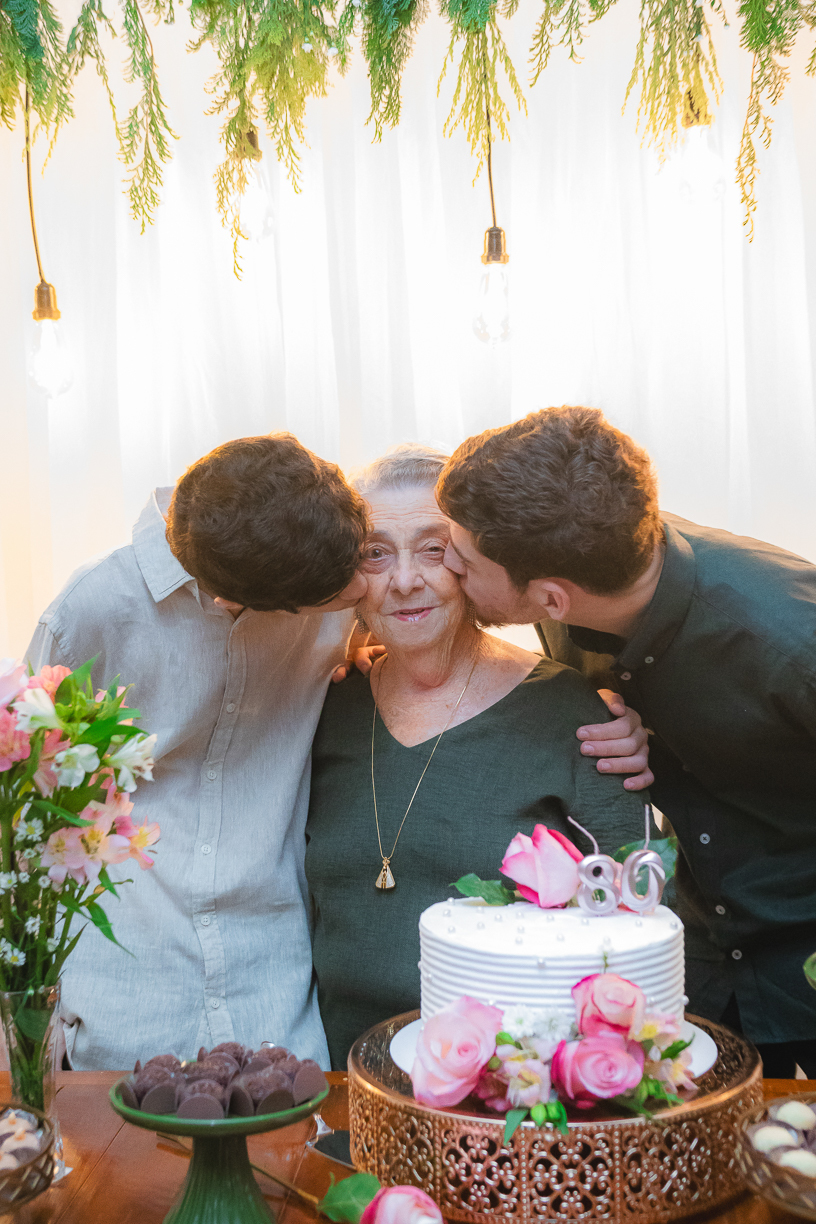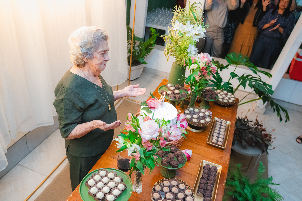 No momento mais emocionante, os netos — com olhos marejados e corações cheios — leram cartas de amor e entregaram rosas, uma a uma, para a avó. Um gesto simples, mas cheio de significado.