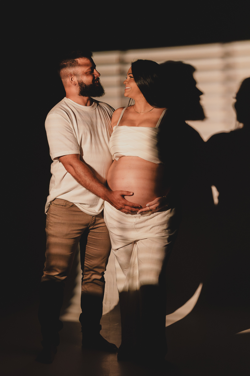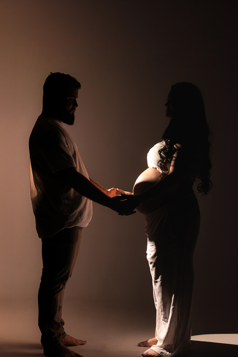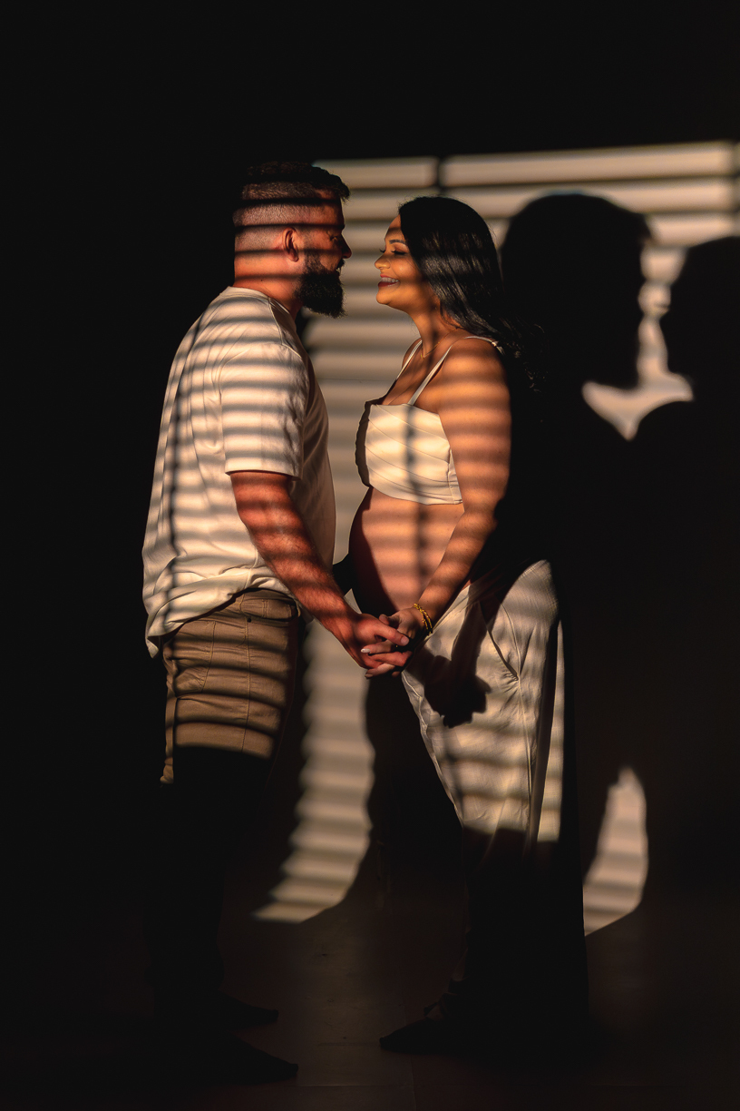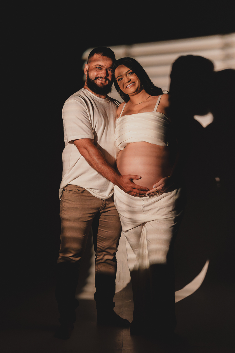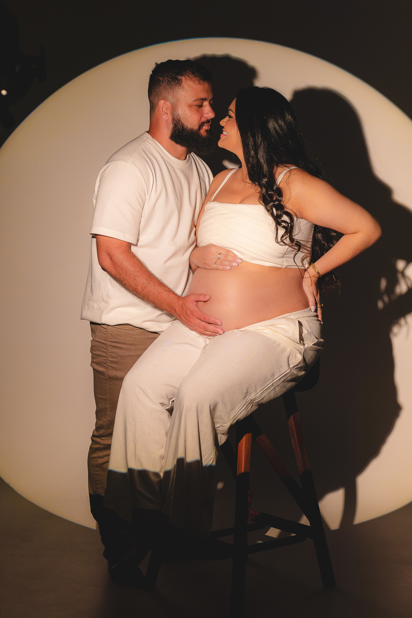 Em um ambiente calmo, com luzes bem posicionadas e sombras que falam por si, cada imagem revelou a beleza da espera... O casal, em harmonia total, mostrou em gestos simples o amor que cresce junto com a nova vida.