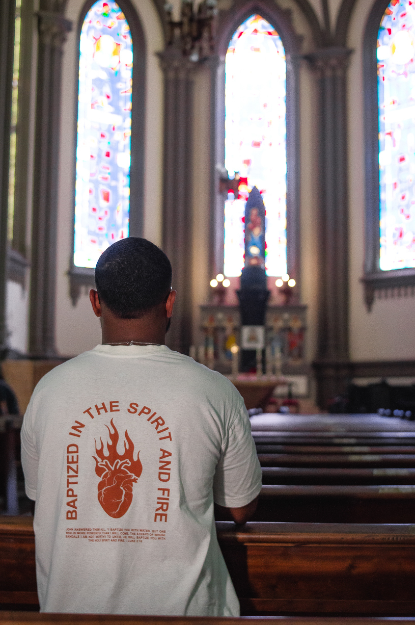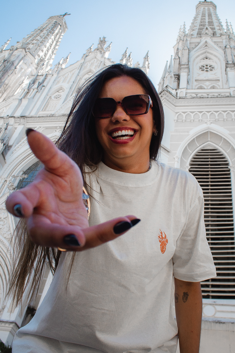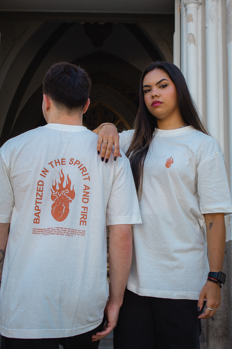Busquei capturar a essência da marca FLAMMA! Essa chama do Espírito Santo que arde nos nossos corações, de quem crê e quer expressar isso em cada detalhe, inclusive do seu jeito de vestir.
